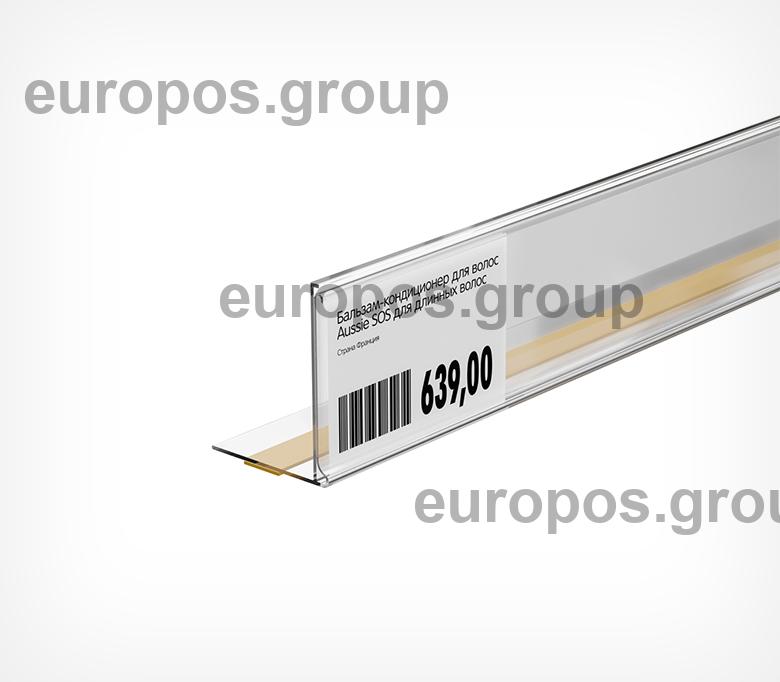 Крепиться на любые гладкие поверхности, такие как стекло, металл, дерево или пластик, с помощью двустороннего скотча, что упрощает монтаж и гарантирует надежную фиксацию. Подходит для полок высотой 32 и 39 мм и может быть использован как с ценниками, так и с брендированными вставками, что делает его универсальным решением для оформления торгового пространства.