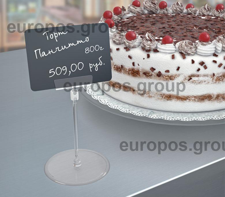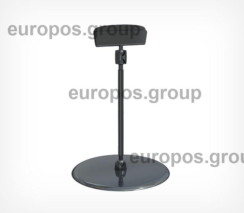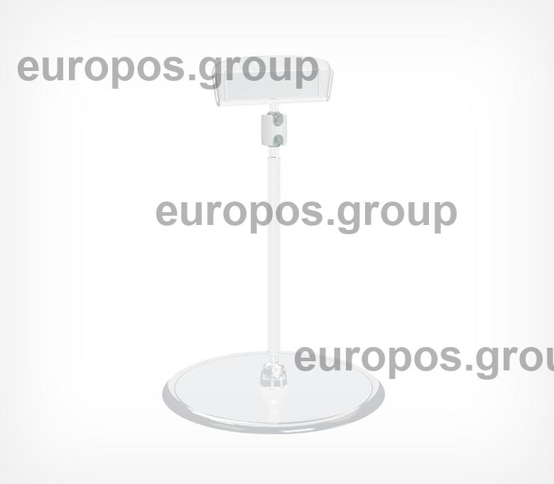 Шарнирный ценникодержатель на большой круглой подставке диаметром 90 мм позволяет расположить ценник непосредственно рядом с товаром и поднять его на высоту 10 см от полки.
