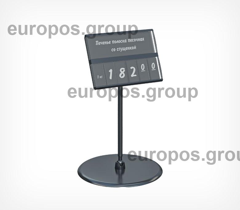 Держатель с большим круглым основанием диаметром 90 мм и высотой ножки 100 мм. Используется в отделе «Гастрономия» и на любых витринных выкладках. Шарнирное соединение обеспечивает максимальную подвижность элементов - позволяет задать любой угол наклона.