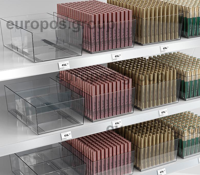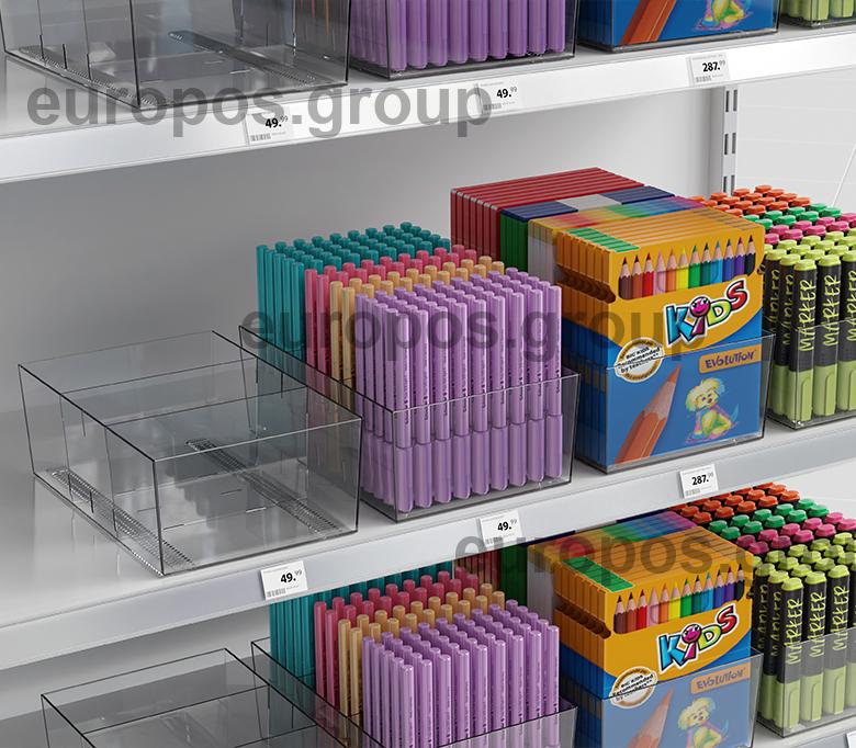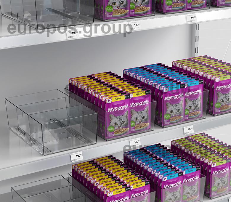 Универсальный накопитель с регулируемыми разделителями идеально подходит для эстетичного размещения фасованных продуктов шириной до 180 мм: упаковок колготок, канцелярии, товаров для животных, косметики и т.п.