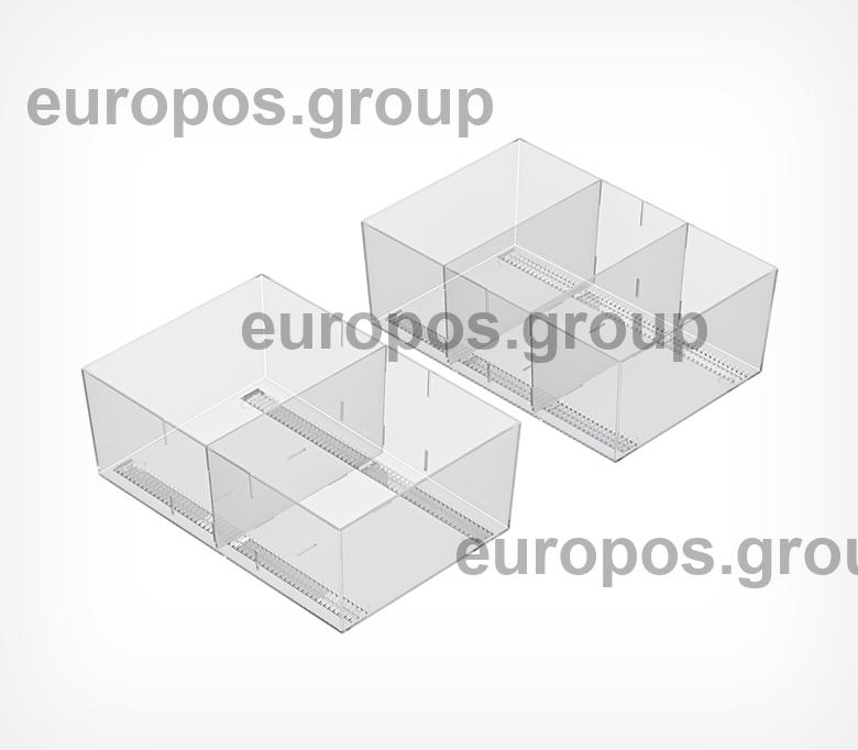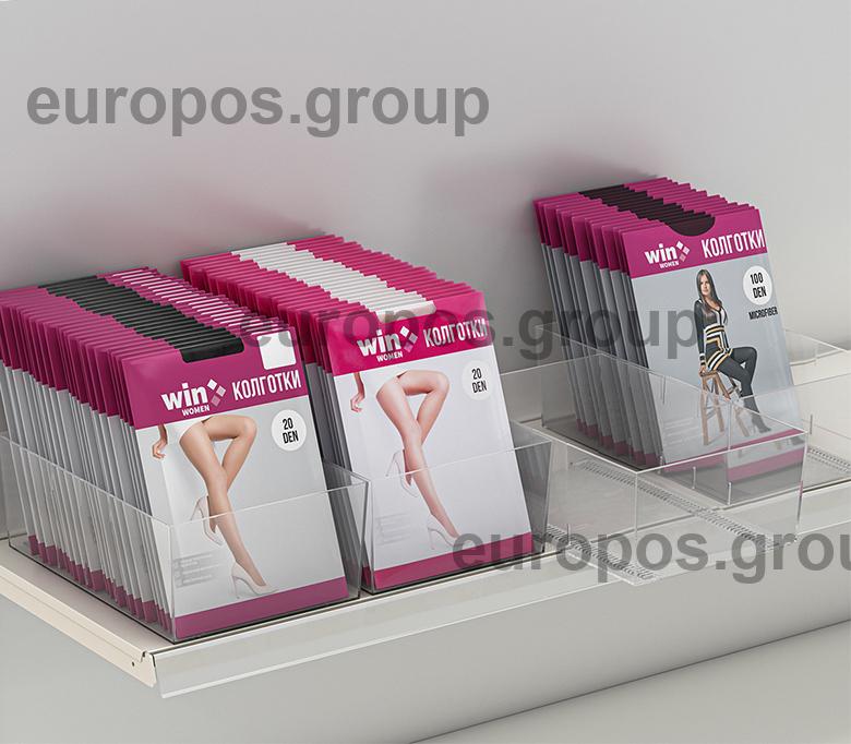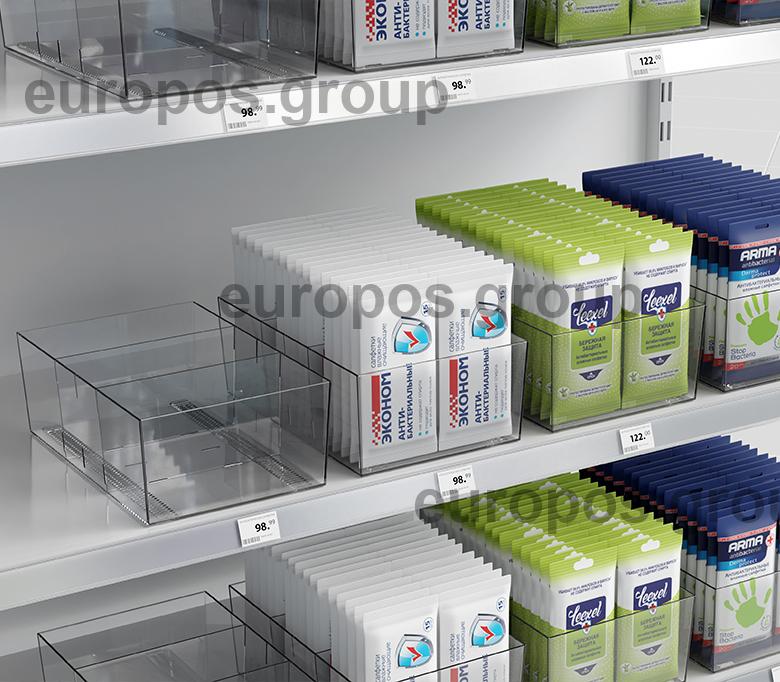 Рифленое дно предотвращает скольжение товара, а прозрачный пластик отлично презентует товар со всех сторон. На лицевой панели могут крепиться самоклеящиеся ценникодержатели.