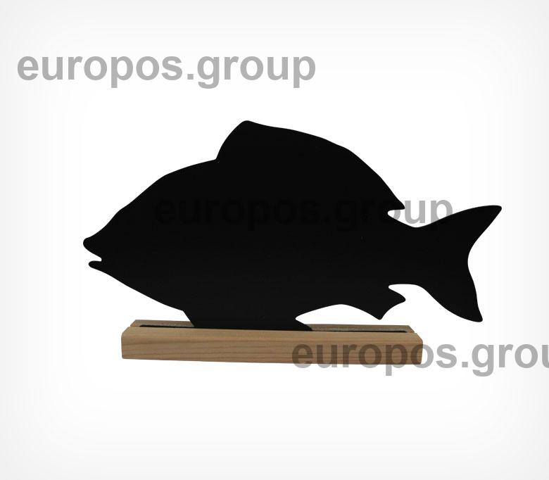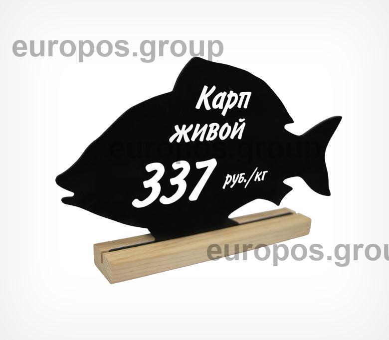 Черная фигурная табличка формата А4 в форме рыбы. Сделана из вспененного ПВХ 3 мм. Используется для написания мелом или маркером ценников и любых рекламных сообщений. Надписи стираются влажной губкой. Идеально подойдет для использования в рыбном отделе. Можно использовать совместно с деревянной подставкой.