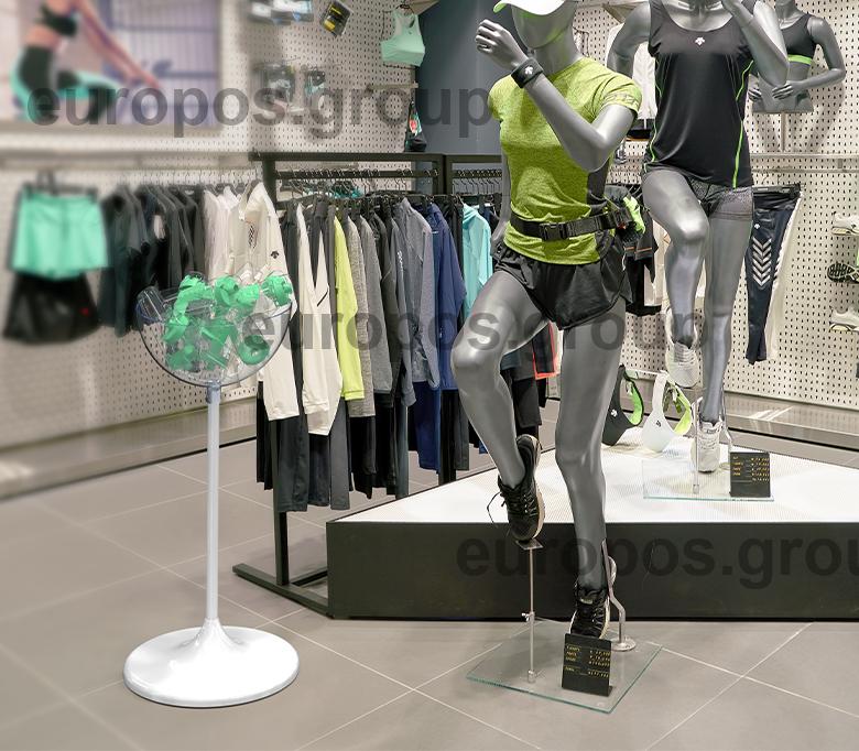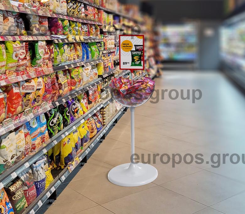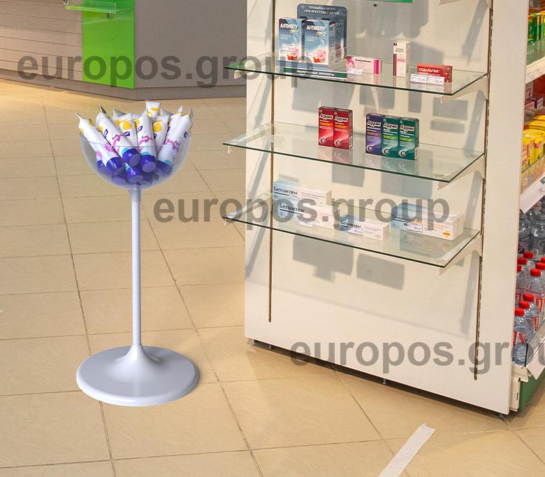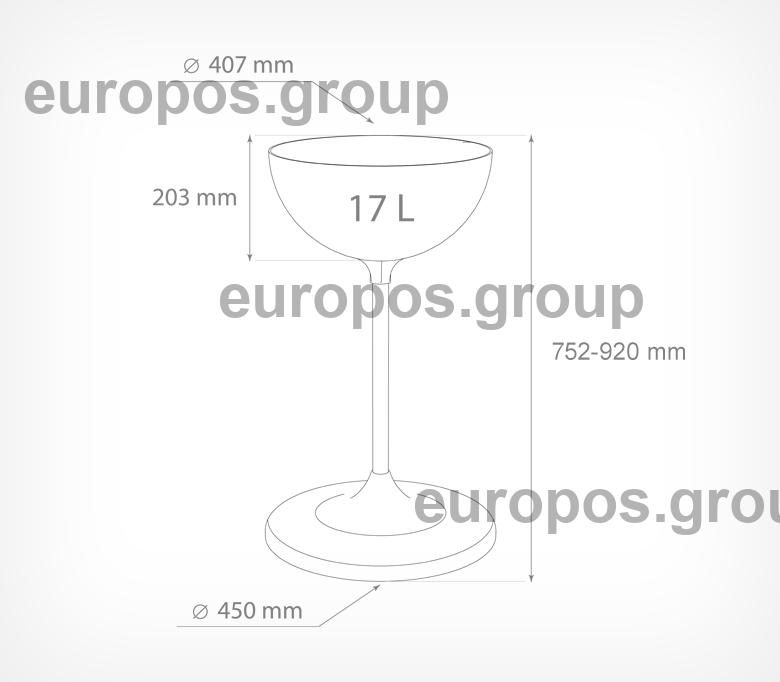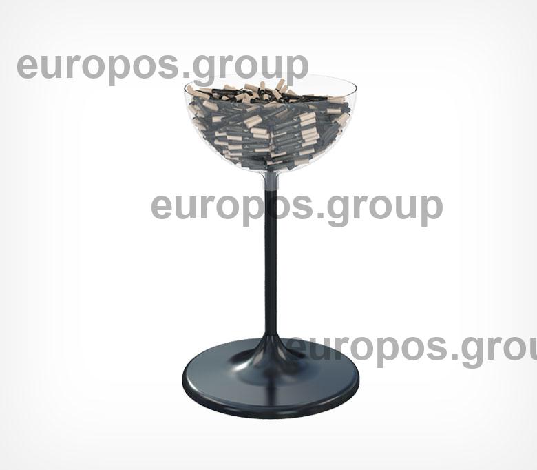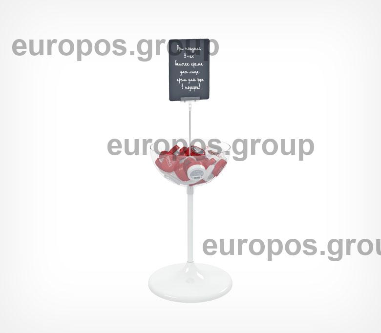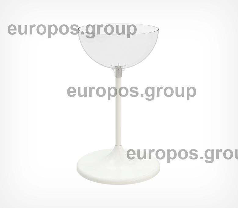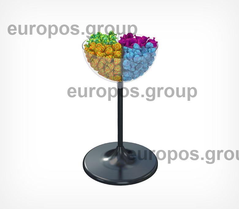 Дисплей состоит из прозрачной пластиковой чаши объемом 17 литров; металлической опорной «ноги» и устойчивого пластикового основания. Чаша для выкладки является цельнолитой, что гарантирует её долгую эксплуатацию.