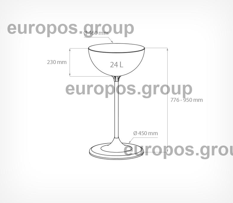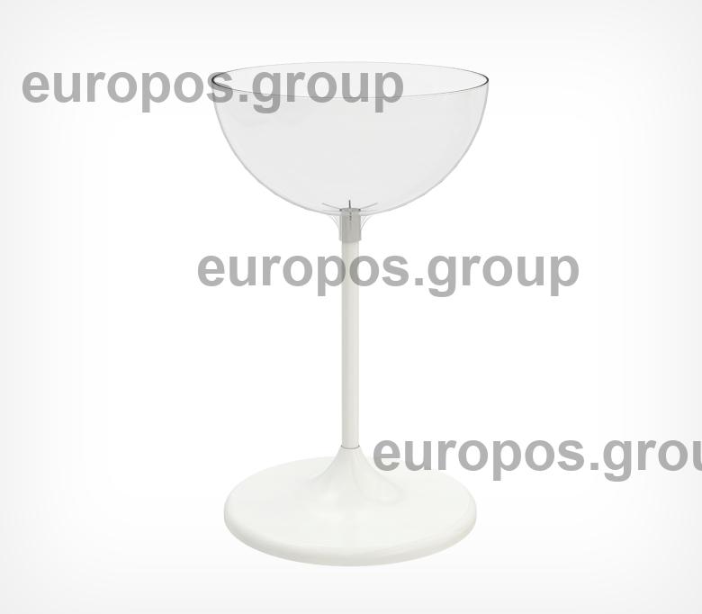 Состоит из прозрачной пластиковой чаши объемом 24 литров; металлической опорной «ноги» и устойчивого пластикового основания. Чаша для выкладки является цельнолитой, что гарантирует её долгую эксплуатацию.