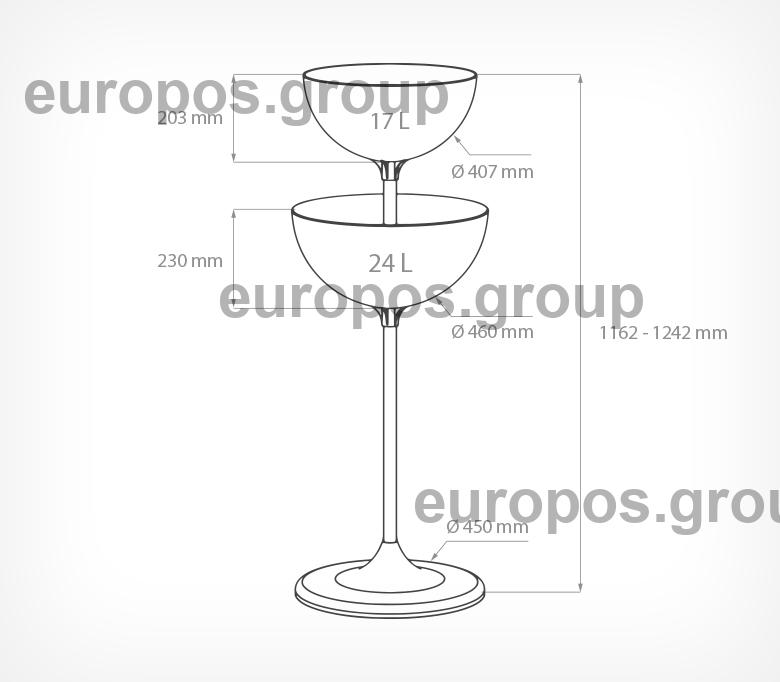 Дисплей состоит из двух прозрачных пластиковых чаш объемом 17 и 24 литра; металлической опорной «ноги» (2 части) и устойчивого пластикового основания. Чаша для выкладки является цельнолитой, что гарантирует её долгую эксплуатацию.