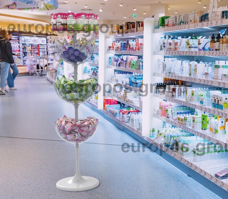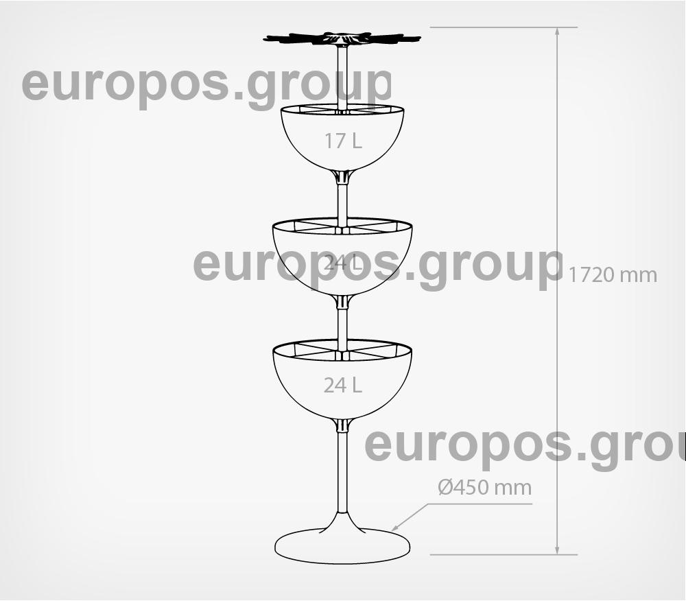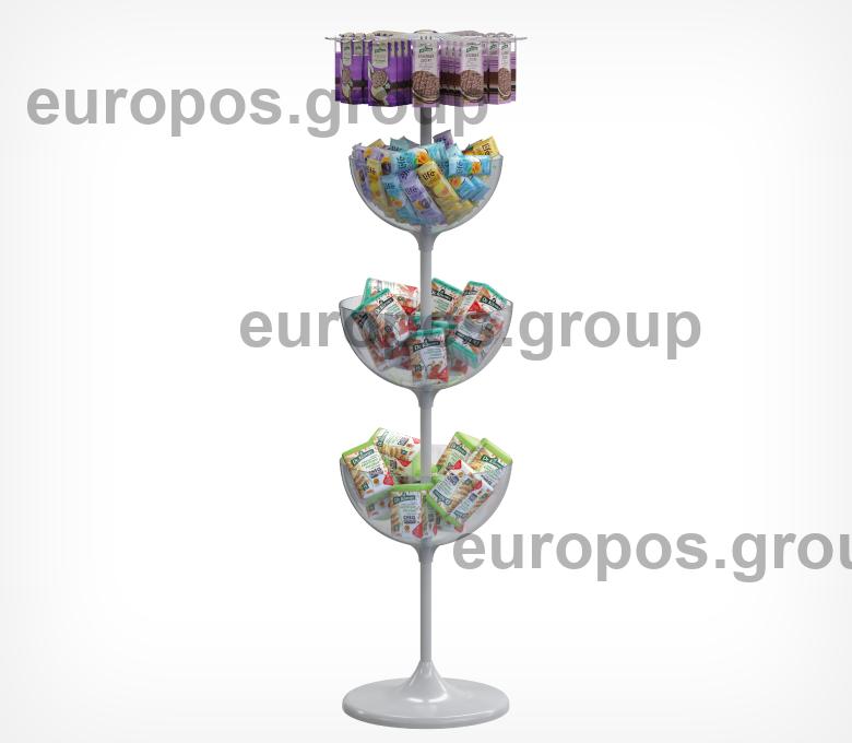 Дисплей UNIBOWL-24-24-17-HP-12 отлично подходит для выкладки продовольственных и непродовольственных товаров в неустойчивой и компактной упаковке в чашах и в упаковке с широкой петлей (европетля) для подвешивания на двенадцати крючках. Дисплей состоит из нескольких частей, которые легко собираются между собой без использования инструмента (см. схему): пластиковое основание, трубы, пластиковые прозрачные чаши объемом 17 и 24 литра, пластиковые разделители, пластиковый держатель с 12 металлическими крючками, заглушка, защищающая полость трубы.