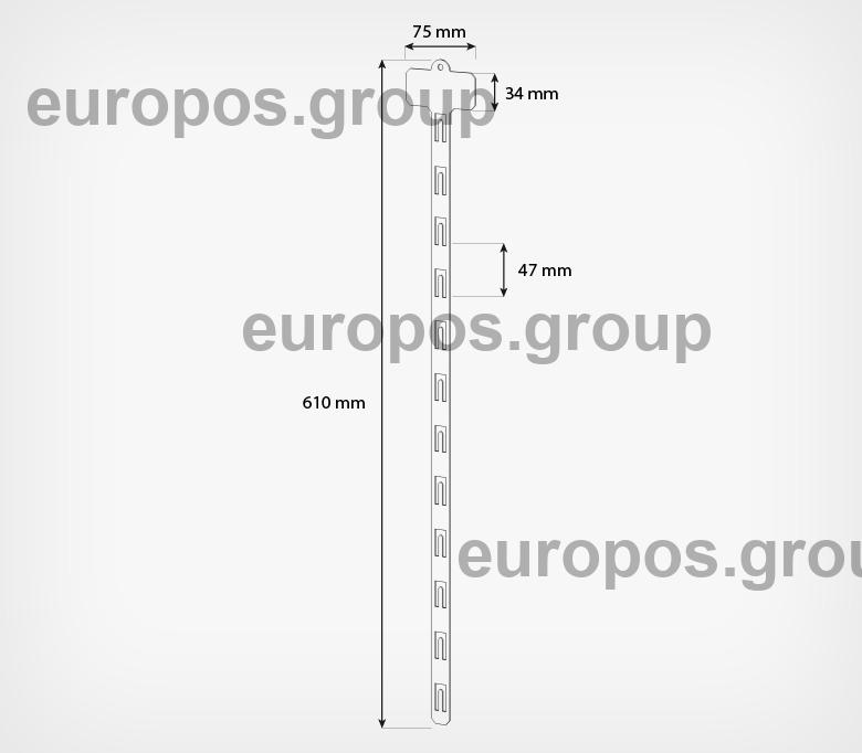 12 пластиковых крючков-фиксаторов расположенных с шагом 47 мм обеспечивают надежное и удобное размещение товаров на ленте. Верхняя часть ленты оснащена топпером для крепления ценников или рекламных наклеек. Дополнительно, в верхней части ленты предусмотрено отверстие для крепления с использованием специального металлического крючка для страйп-лент или хомута.