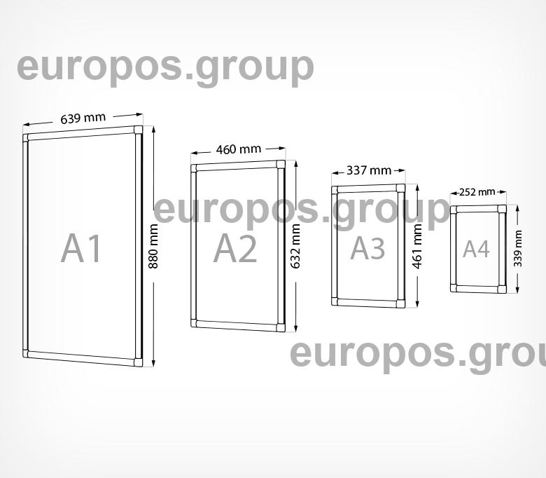 Два варианта рамок: с прямоугольными и закругленными углами. В комплект входит защитный антибликовый экран 0,3 мм и крепеж. Материал задней стенки - оргалит. Стандартные форматы - А1, A2, A3, А4.