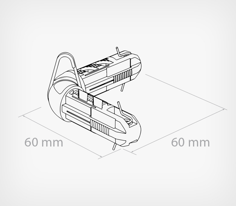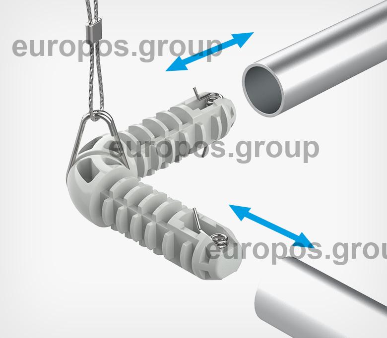 Оснащён встроенной металлической петлей и пружиной, которые обеспечивают надёжную фиксацию внутри трубки. Петля позволяет легко и безопасно подвесить систему к потолку с помощью троса или цепи, упрощая установку. Используя четыре соединителя и трубки нужной длины, можно собрать прочную прямоугольную подвесную конструкцию.