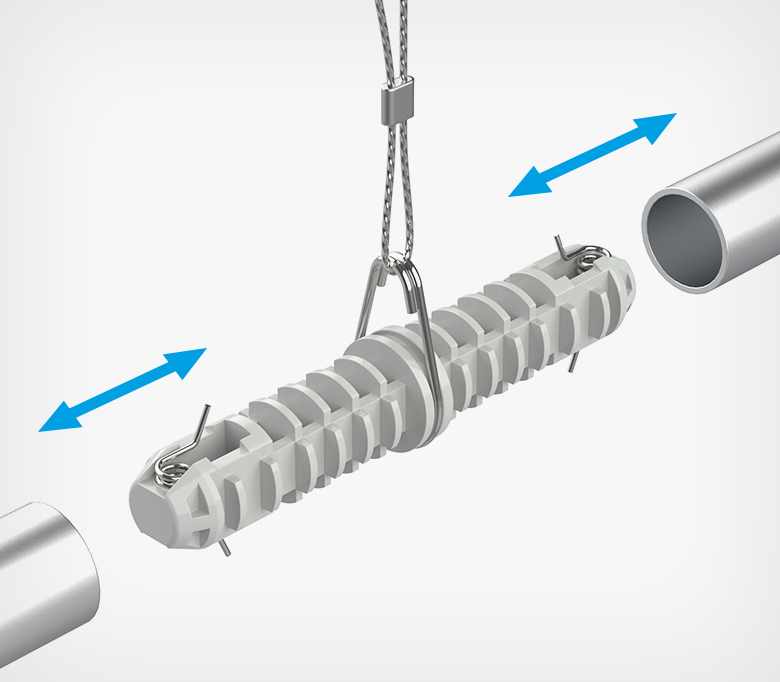 Изготовлен из прочного пластика и оснащён встроенной металлической петлей и пружиной, обеспечивающими фиксированное крепление внутри трубок.