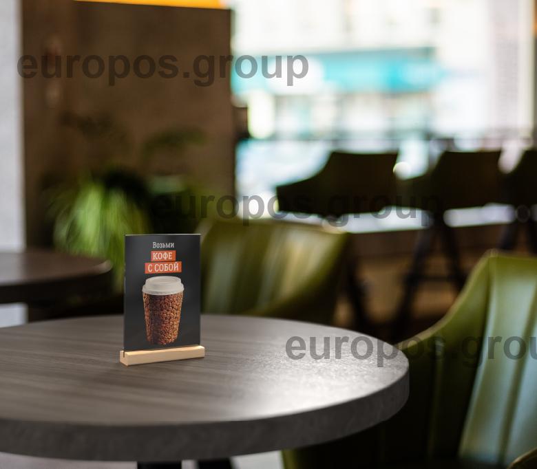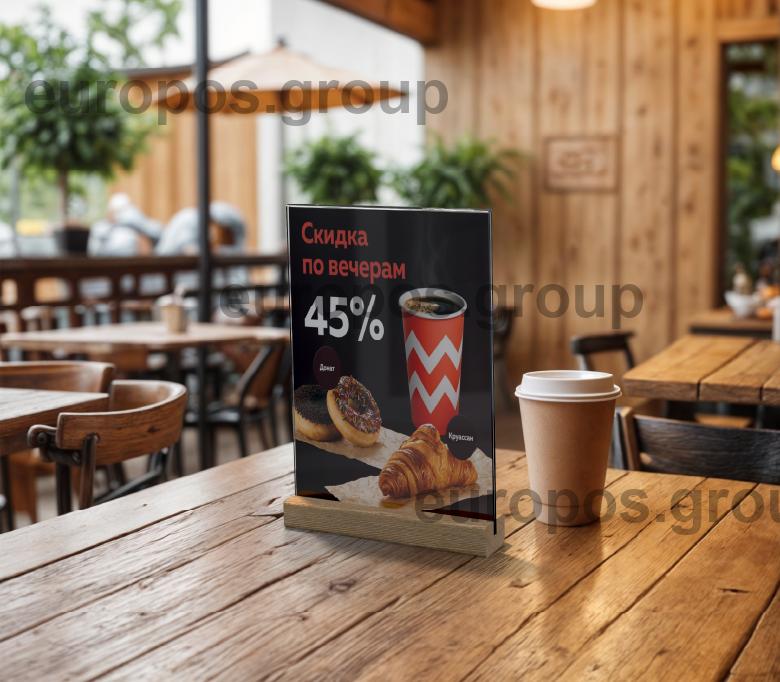 Рекламный тейбл-тент формата А5 на деревянном основании предназначен для эффективного размещения информации об акциях и специальных предложениях. Универсальное решение для установки на столах, барных стойках или в зонах ожидания, служит для привлечения внимания клиентов, способствует увеличению продаж и улучшению обслуживания. Дизайн, в котором выполнен тейбл-тент подойдет для любого интерьера. Удобная установка акрилового кармана, быстрая замена печатной вставки.