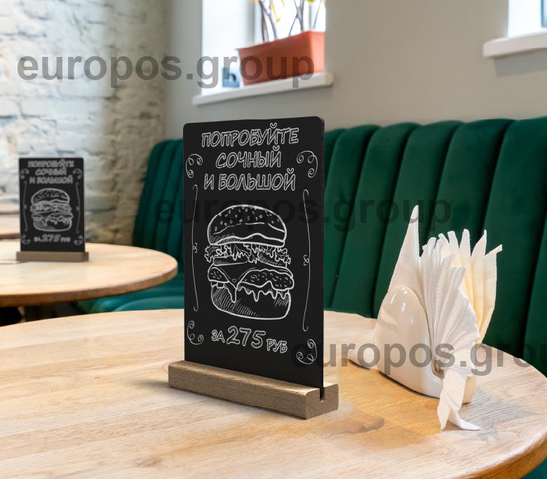 Тейбл-тент с маркерной доской формата А5 на деревянном основании предназначен для эффективного размещения информации в различных заведениях, таких как магазины, кафе, рестораны, кондитерские и кофейни. Готовое решение включает все необходимое: деревянную подставку, черную табличку формата А5 и меловой маркер белого цвета.