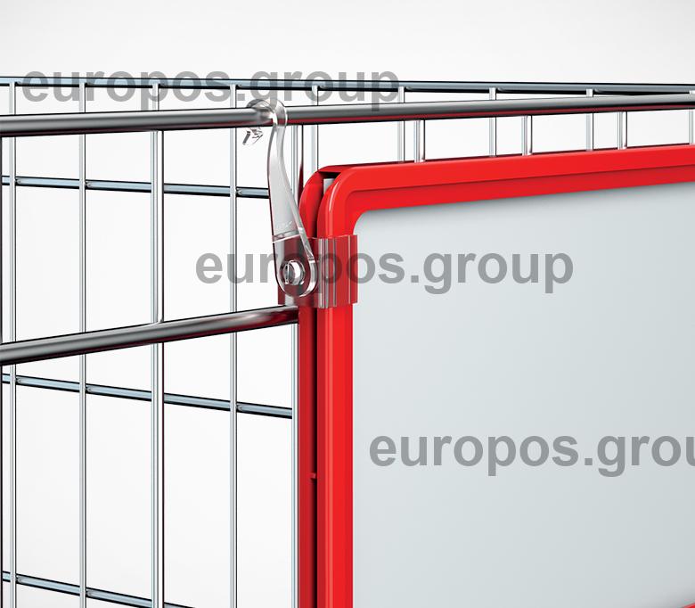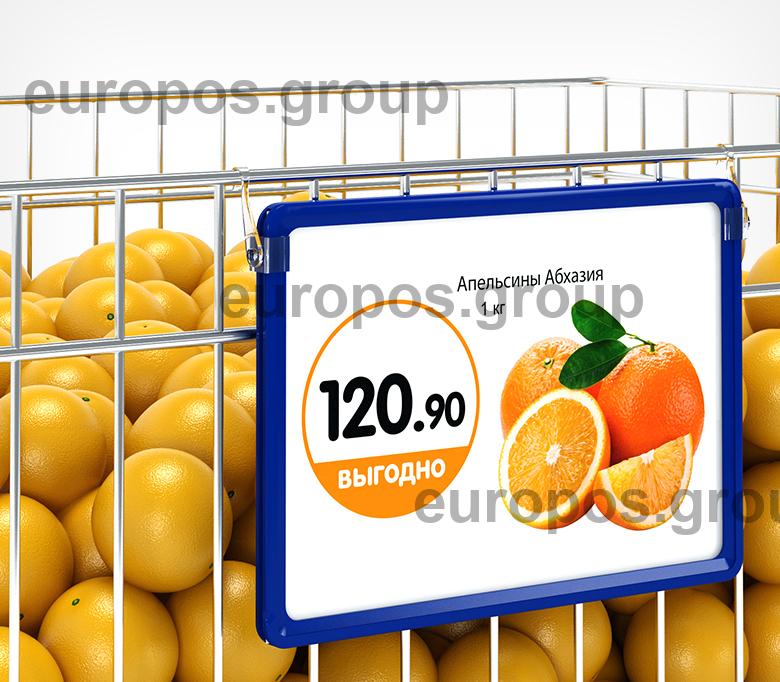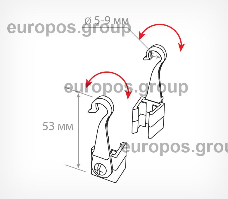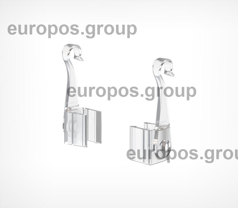 Крючок с подвижным основанием для подвешивания пластиковых рамок на подвесных профилях и металлических покупательских корзинах. Закрепляются с боковой стороны рамки. Для подвешивания одной рамки необходимо два крючка разной ориентации. Изготовлен из прозрачного ударопрочного пластика.