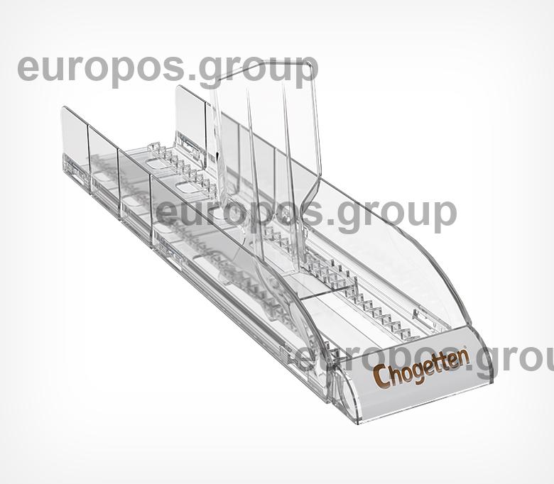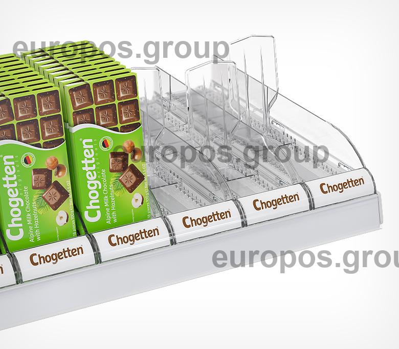 Лоток для выкладки плиточного шоколада позволяет на малой площади полки эффективно уместить большой ассортимент продукции. Поставляется в собранном виде, благодаря этому установка на полку занимает за считанные секунды. В набор включены цветные вставки во фронт для организации сегментации на полке по типам шоколада. Внутренняя ширина лотка 85 мм, глубина 350 мм.