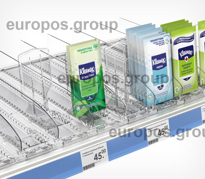 Пластиковая задняя опора используется индивидуально или в комплекте с ребристым профилем BACKLINE. Ребристые выступы в нижней части опоры удерживают плоские упаковки товара, обеспечивая его идеальную подачу покупателю.