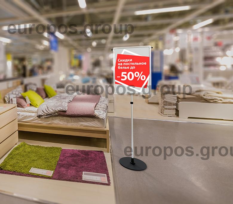 Стойка телескопическая рекламная с Т-образным держателем применяется в зонах распродаж, «островных» и паллетных выкладках товара для привлечения внимания к акционной, рекламной и любой другой информации.