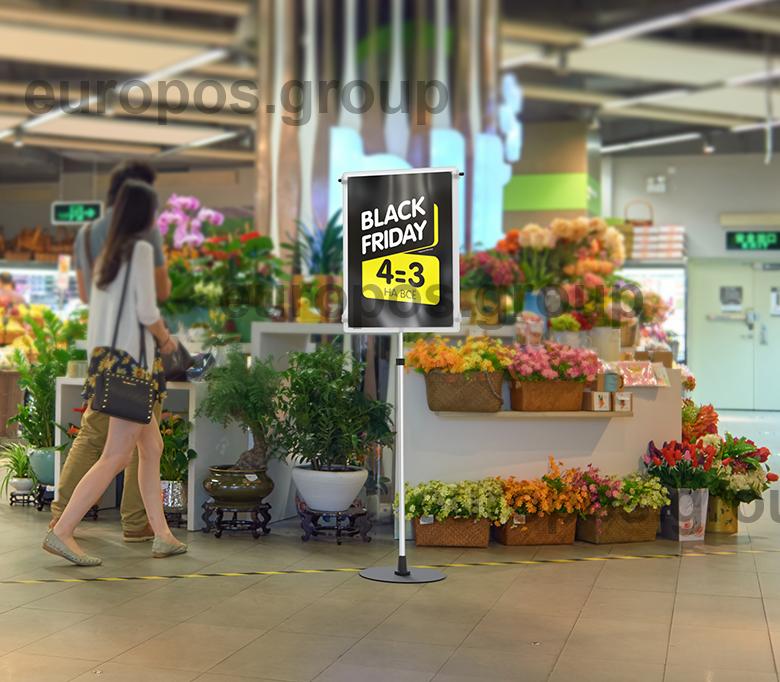 Стойка телескопическая рекламная двухсторонняя применяется в зонах распродаж, «островных» и паллетных выкладках товара для привлечения внимания к акционной, рекламной и любой другой информации.