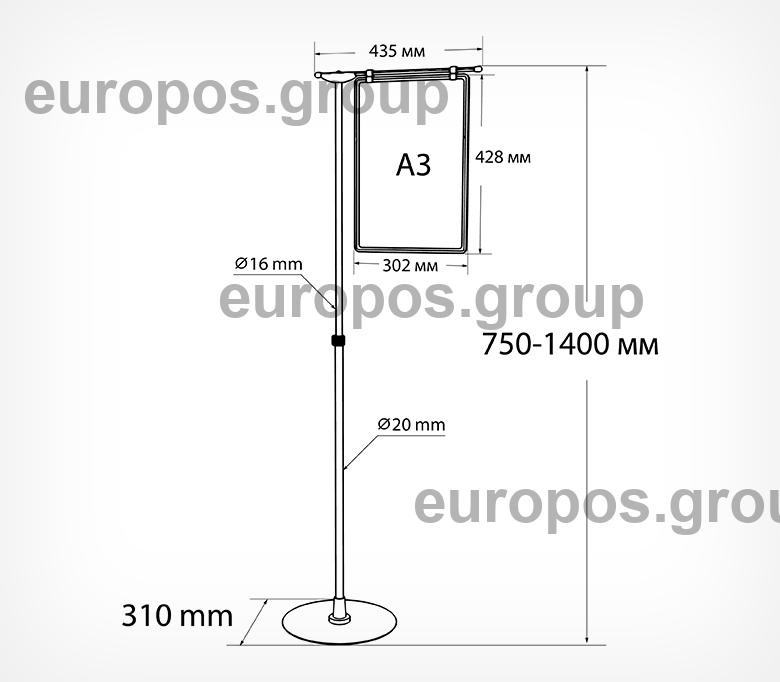 Рекламная стойка имеет устойчивое основание, а также регулируется по высоте с 725 до 1350 мм за счет наличия телескопической трубки.