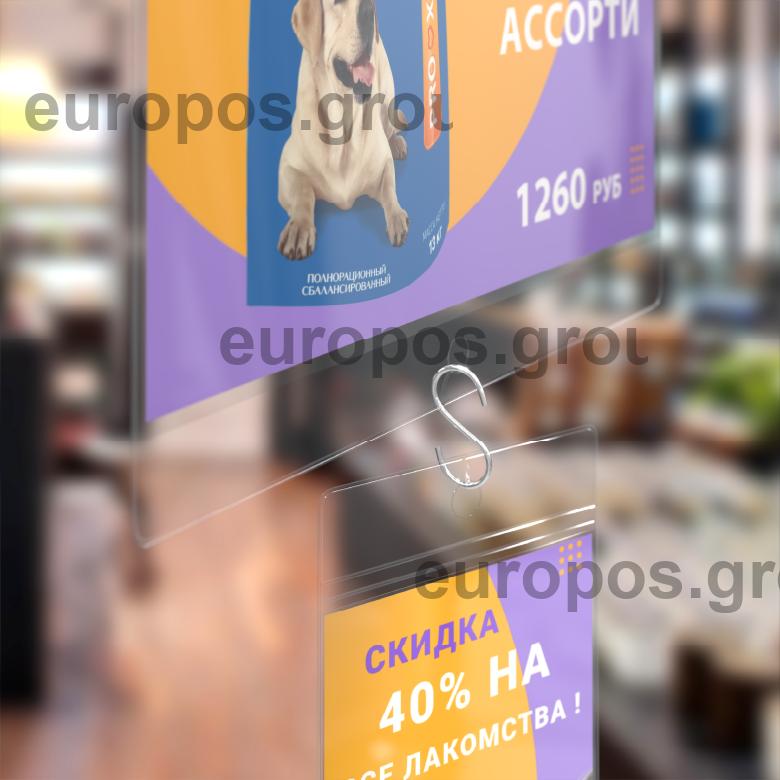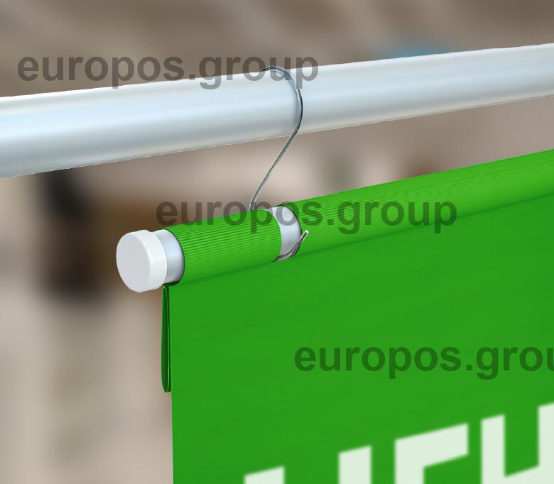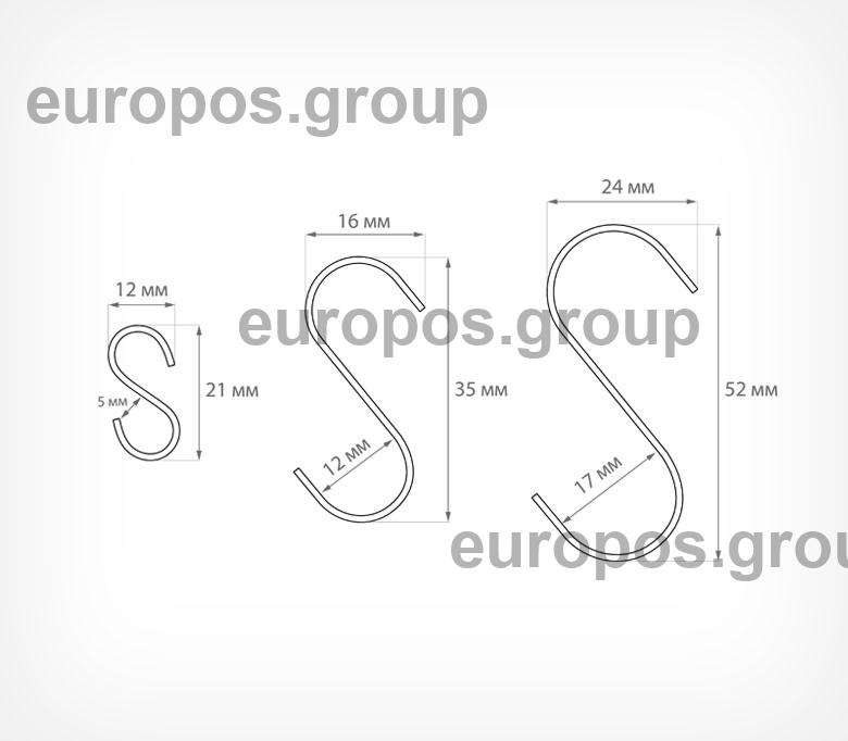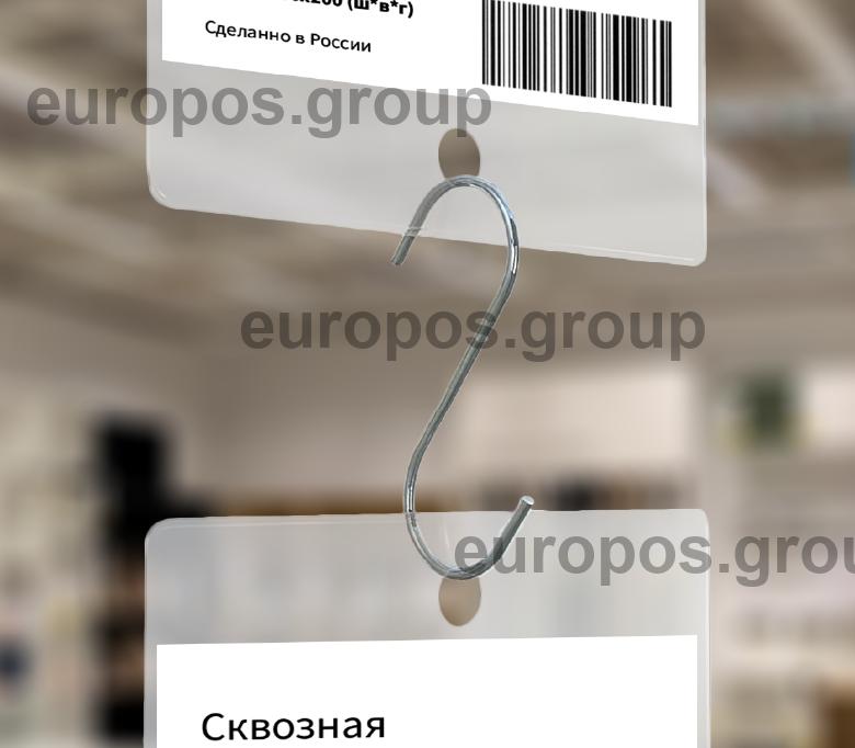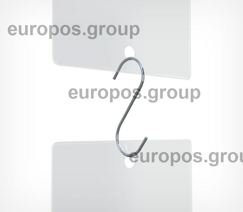 Металлический S-образный крючок для подвешивания различных рекламных носителей. Может использоваться с пластиковыми потолочными креплениями типа MB или MBR, а также в качестве соединителя нескольких подвесных конструкций.