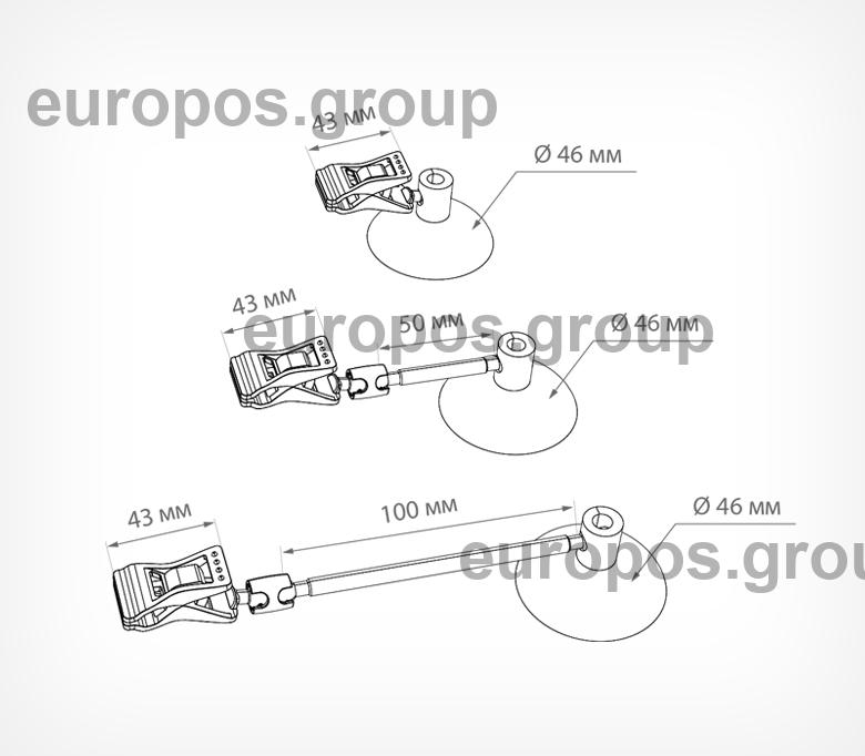 Усиленная присоска с двумя контурами крепления с зажимом для табличек толщиной 1-2 мм.Ø присоски 46 мм. Установка зажима под углом 0° или 90°. Варианты длины ножки - 0, 50, 100 мм.
