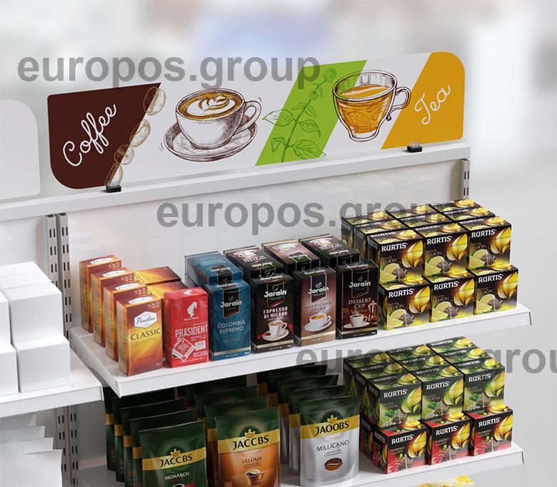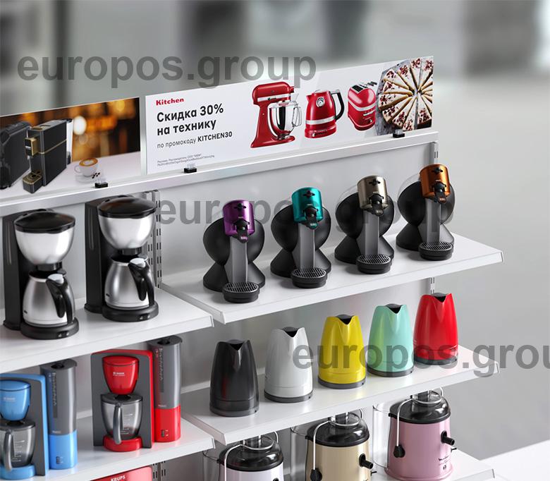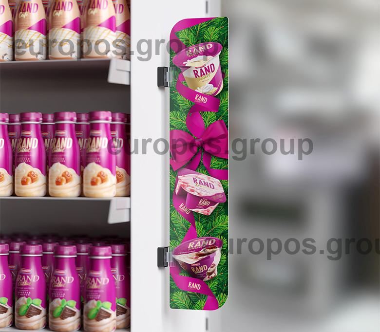 Размещение информации возможно как в горизонтальном, так и вертикальном положении: на полке, под полкой, на верхних и боковых торцах стеллажей и холодильников.