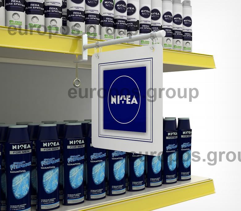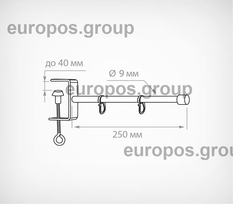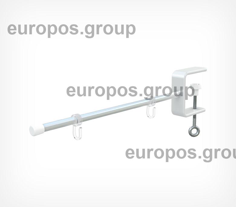 Держатель вывески на струбцине позволяет крепить конструкцию непосредственно к полке толщиной не более 40 мм. На прямой трубке (Ø трубки 9 мм, длина 250 мм) имеются пластиковые крючки для подвешивания вывески. Расстояние между крючками регулируется.