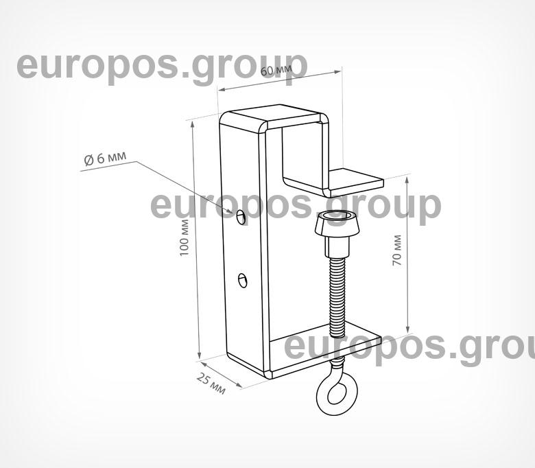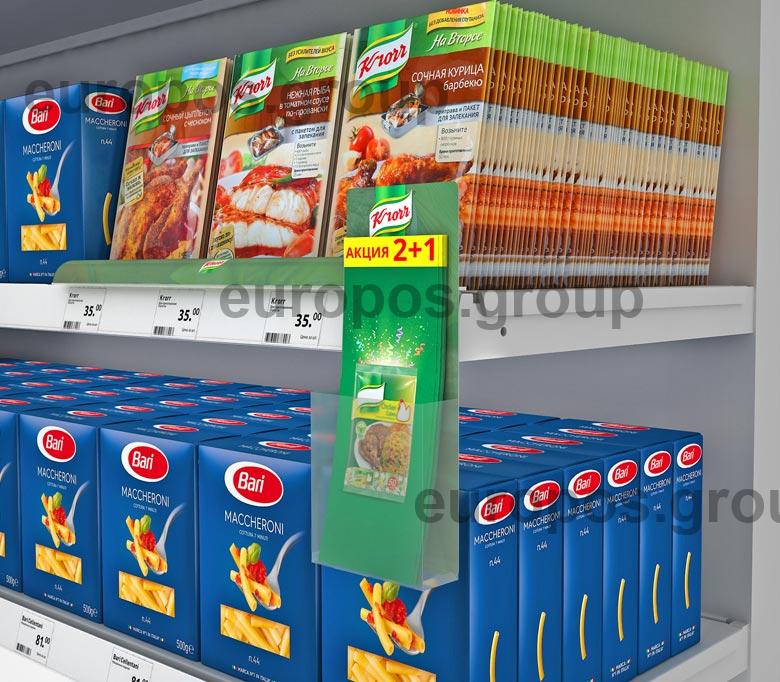 Держатель вывески на струбцине с двумя отверстиями и отгибом позволяет крепить конструкции к полкам толщиной до 40 мм, оснащенными ценниками или бортиками. Предназначен для различных вывесок, "паразитных" дисплеев и прочих конструкций из пластика, металла, картона.